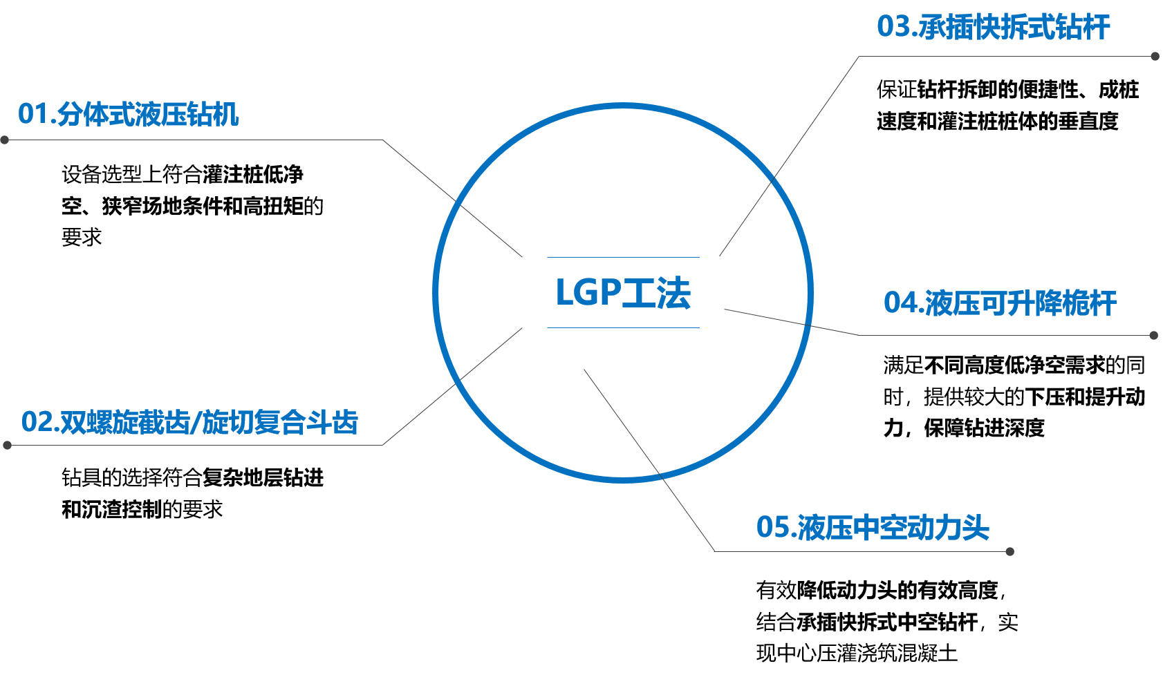 針對應用過程中的痛難點,項目團隊進行了配套研發(fā)和工藝升級,形成基于“五大關(guān)鍵技術(shù)+六大關(guān)鍵工序”的低凈空中心壓灌灌注樁(LGP)施工工法體系。