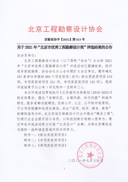 近日,北京工程勘察設(shè)計(jì)協(xié)會(huì)發(fā)布《關(guān)于2021年“北京市優(yōu)秀工程勘察設(shè)計(jì)獎(jiǎng)”評(píng)選結(jié)果的公告》(京勘設(shè)協(xié)字【2021】第013號(hào))。我院承擔(dān)的23個(gè)項(xiàng)目榮獲2021年度北京市優(yōu)秀工程勘察設(shè)計(jì)獎(jiǎng),其中一等獎(jiǎng)8項(xiàng),二等獎(jiǎng)7項(xiàng),三等獎(jiǎng)8項(xiàng)。