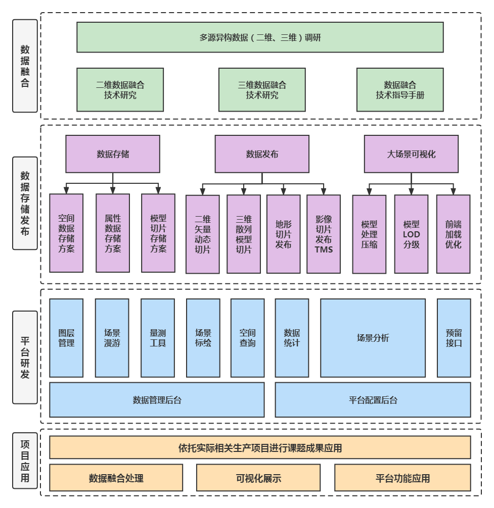 基于通用GIS數(shù)據(jù)(遙感影像、數(shù)字地形模型、傾斜攝影模型、點云及BIM模型等),通過數(shù)據(jù)切片算法,研究三維原始數(shù)據(jù)向場景數(shù)據(jù)轉(zhuǎn)換技術(shù)方案,基于坐標(biāo)參考、數(shù)據(jù)格式、屬性掛接、紋理壓縮及模型輕量化,實現(xiàn)多源異構(gòu)二三維數(shù)據(jù)融合。