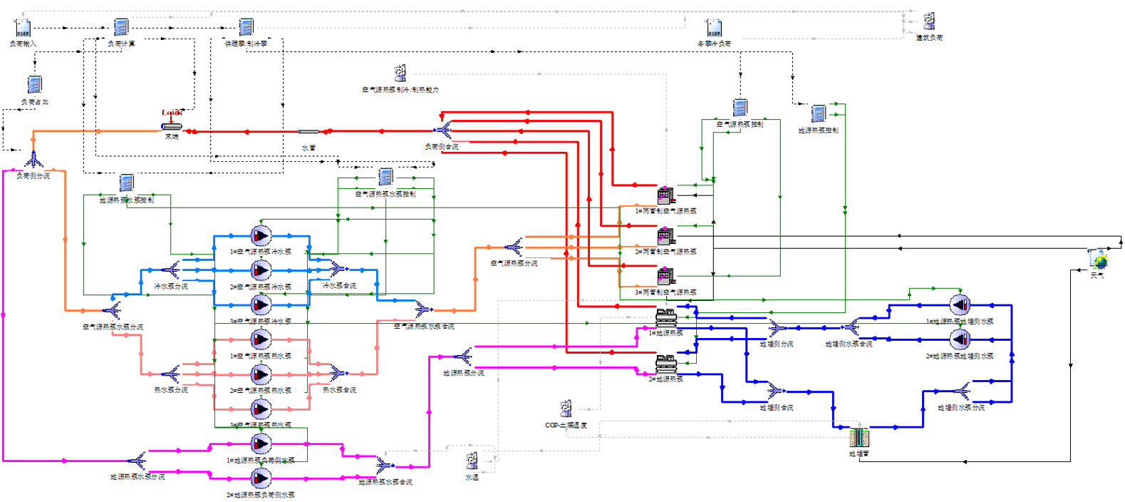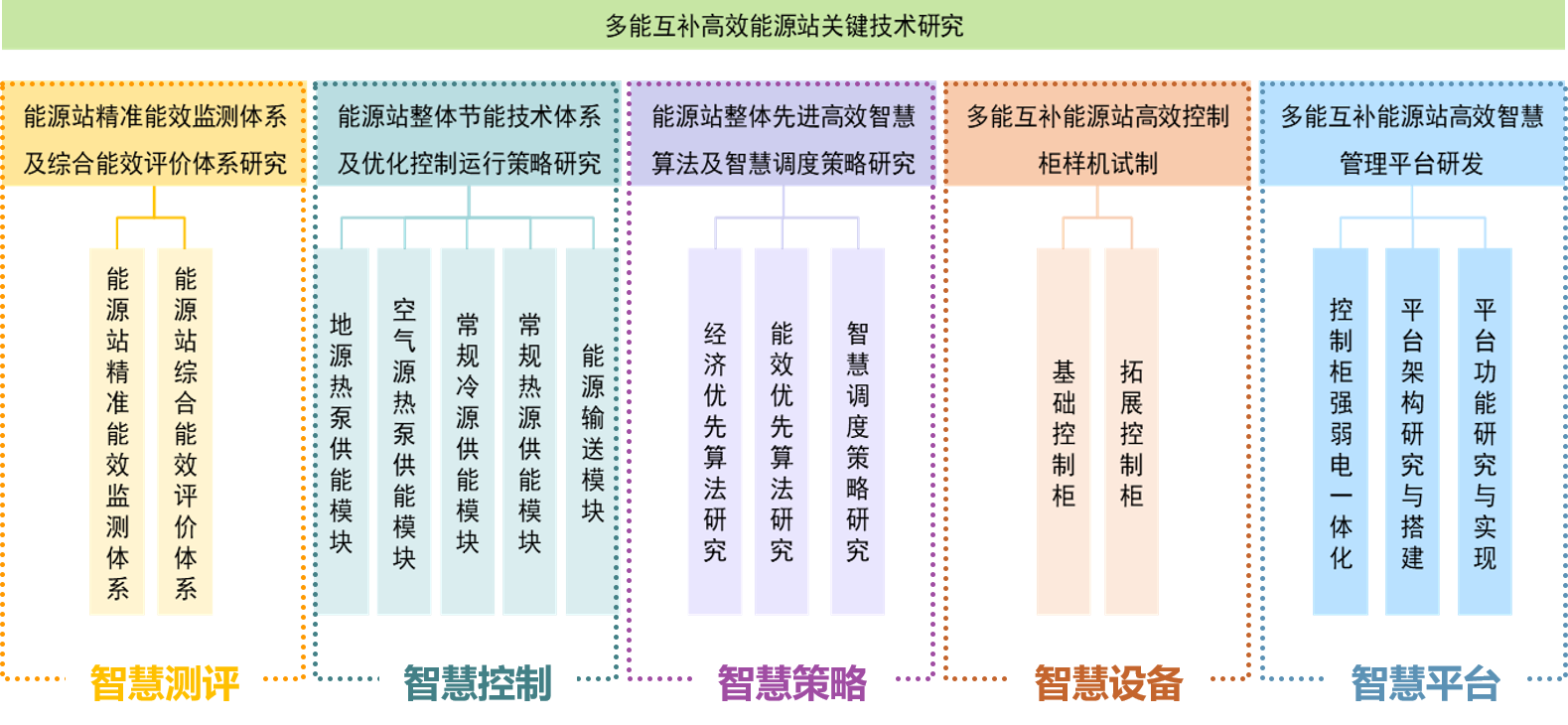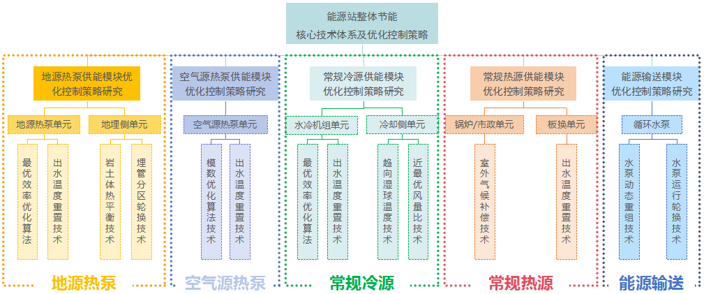 研發(fā)不同供能子模塊及輸送模塊的多種節(jié)能技術(shù)算法和智能控制策略,形成了以“冷卻側(cè)智追隨”“冷熱源側(cè)智尋優(yōu)”“輸送側(cè)智適應(yīng)”為主的多能互補(bǔ)能源站整體節(jié)能技術(shù)體系。